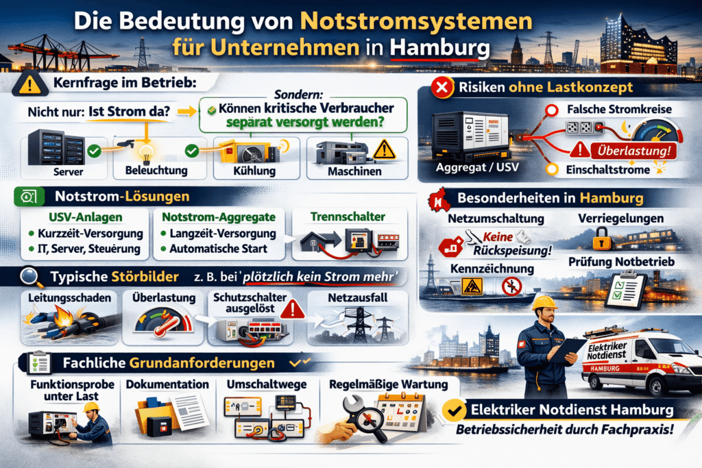 Damit stromausfall aktuell betriebsseitig beherrschbar bleibt, gehört die Funktionsprobe unter Last und die Dokumentation der Umschaltwege zur fachlichen Grundanforderung von Elektriker Notdienst Hamburg.
