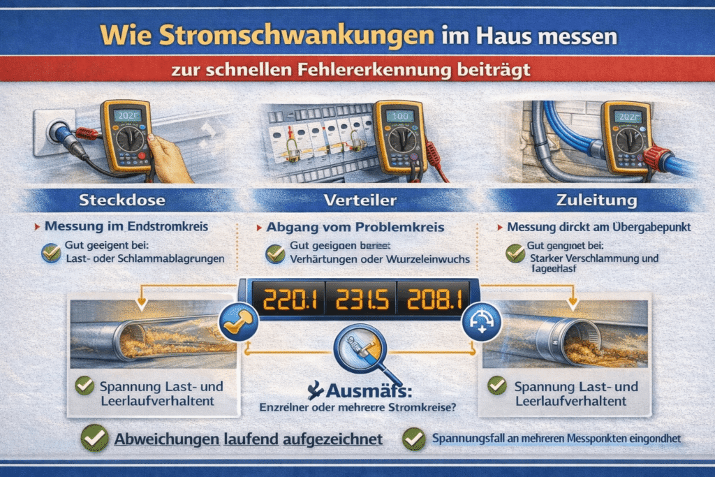 Bei der Messung geht es daher nicht um „irgendeinen“ Wert, sondern um reproduzierbare Ergebnisse an klar definierten Punkten wie Steckdose, Abgang im Verteiler und Zuleitung. Dabei wird geprüft, ob die Abweichung lastabhängig entsteht oder bereits im Leerlauf vorhanden ist.